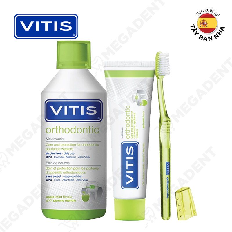 Quy cách: Bộ (Nước súc miệng Vitis Orthodontic: 500ml, Kem đánh răng Vitis Orthodontic 100ml, bàn chải đánh răng Vitis Orthodontic.
