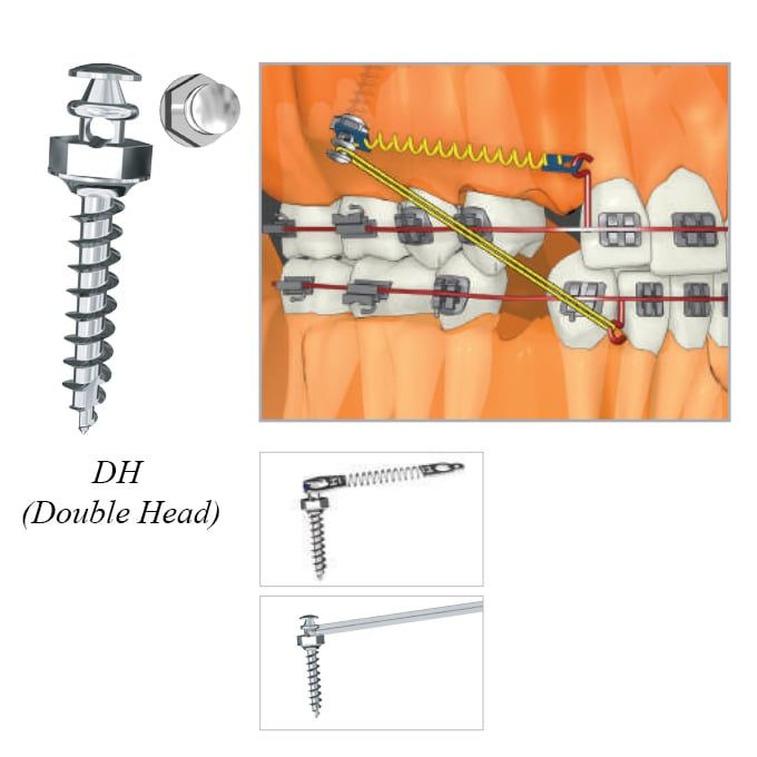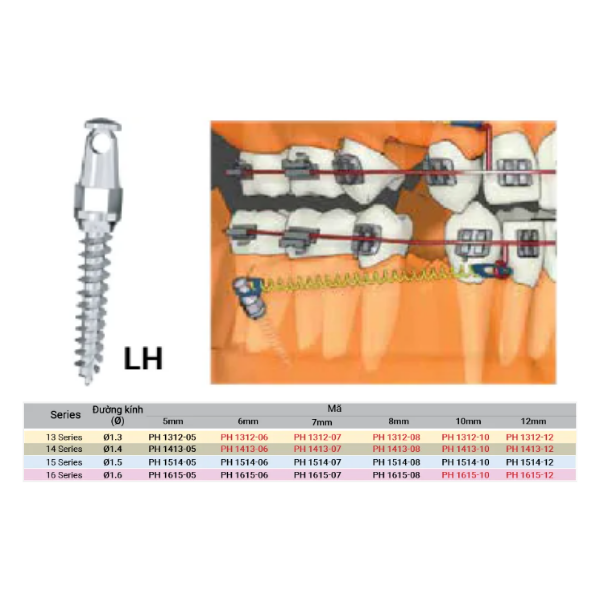 5 Loại Absoanchor đầu dạng mắc cài (BH) – Bracket Head – Vít bên phải 1) Các vị trí được khuyên dùng: Nướu dính hàm trên và hàm dưới bao gồm khẩu cái. Tương tự, vùng nối giữa khẩu cái bao gồm vùng bên cạnh đường giữa. 2) Các loại dây lò xo được khuyên dùng : Dây thun chuỗi, thun chỉ và lò xo Nickel titanium …Cũng có thể gắn dây cung. |
