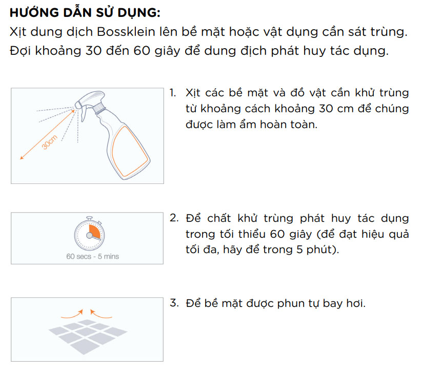 - Xịt/lau các bề mặt và đồ vật cần khử trùng từ khoảng cách khoảng 30cm để chúng được làm ẩm hoàn toàn và để chất khử trùng hoạt động trong tối thiểu 60 giây.