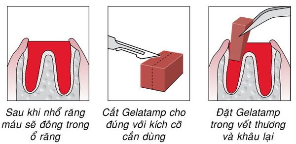 Gelatamp được vô trùng và sẵn dùng. Có thể điều chỉnh kích thước nhỏ xuống cho phù hợp với khoang ổ răng nếu cần. 2 đơn vị Gelatamp có thể dùng cho vết thương lớn. Phải chắc rằng miếng xốp không bị nén. Áp lực trên miếng xốp sẽ phá hủy cấu trúc của nó và ngăn chặn tụ máu trong miếng xốp.